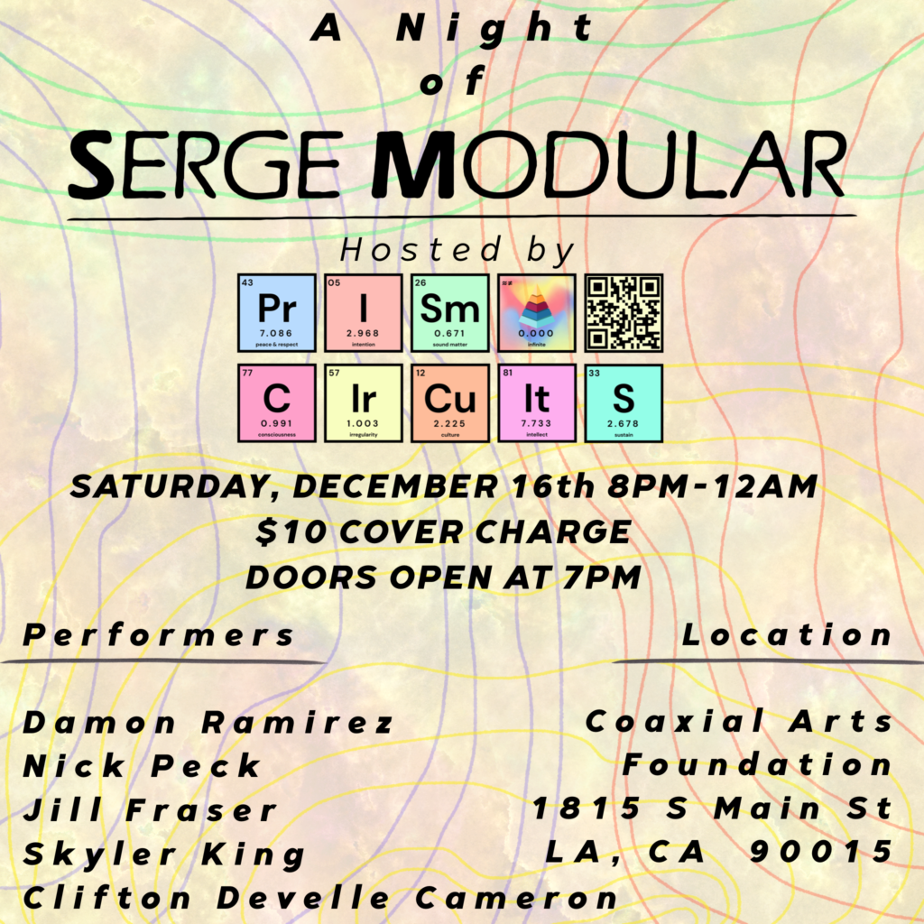 A Night of Serge Modular is an immersive exploration of sound, showcasing the unique capabilities of Serge Modular synthesizers. These performances emphasize the raw, experimental nature of modular synthesis, blending abstract tones, evolving textures, and intricate patching techniques. Each artist brings their distinct approach, transforming the Serge system into a dynamic instrument of sonic expression. It’s a night where innovation meets artistry, celebrating the limitless possibilities of modular sound design.